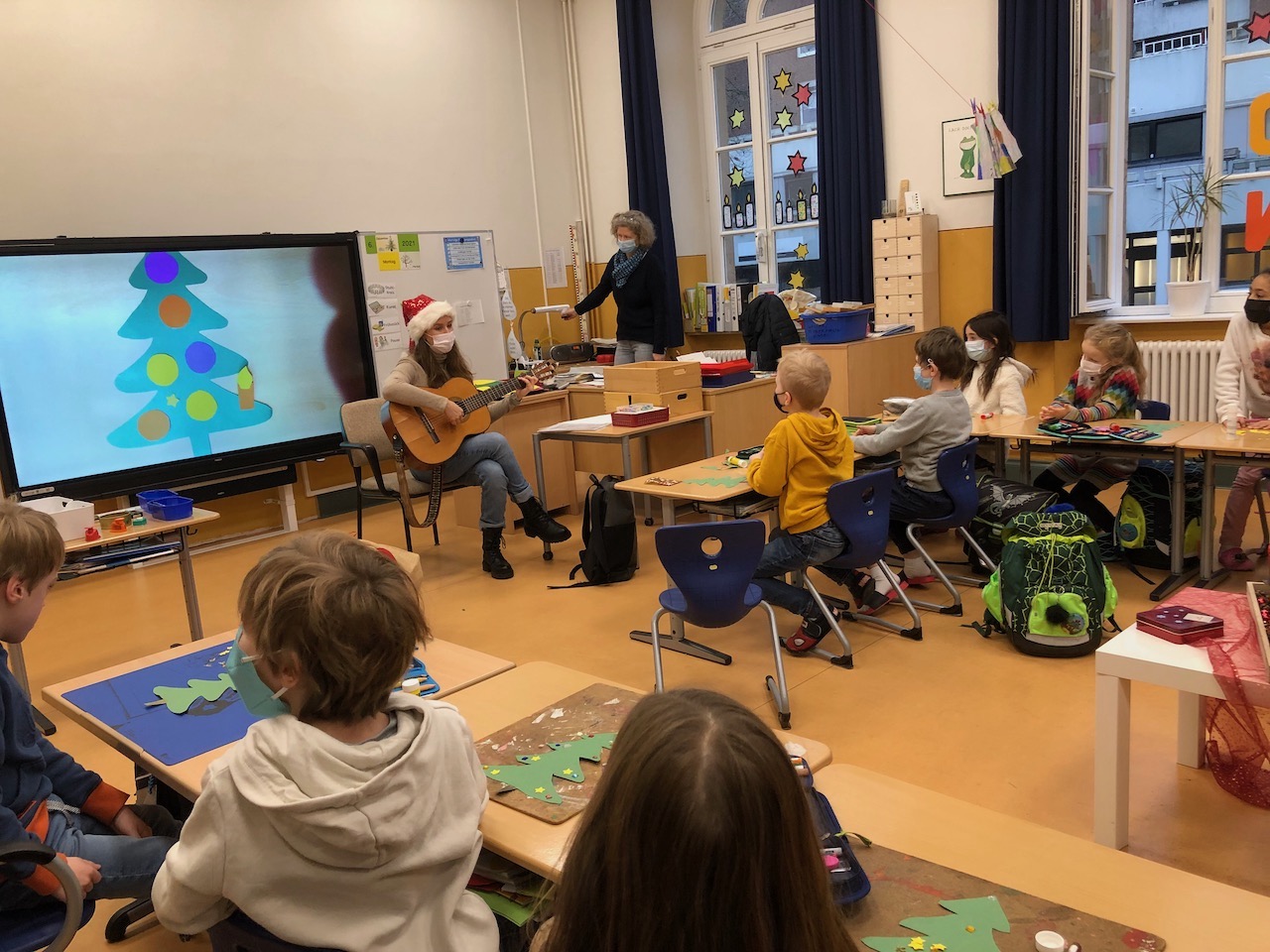 Heute am Nikolaustag sollte eigentlich der Nikolaus zu uns in die Schule kommen. Leider war er zu beschäftigt. Aber er schickte eine würdige Vertretung, nämlich unsere Musiklehrerin Frau Schäfer. Ausgestattet mit Nikolausmütze, Sack und Gitarre kam sie heute Vormittag in jede Klasse. Sie hatte richtig schwer zu schleppen, 8 große Säcke, für jede Klasse einen, gefüllt mit Schokoladennikoläusen und vitaminreichen Mandarinen. Bevor aber der Sack geöffnet wurde, musste erst einmal ein Nikoluaslied gesungen werden. Das war eine gelungene Nikolausüberraschung.