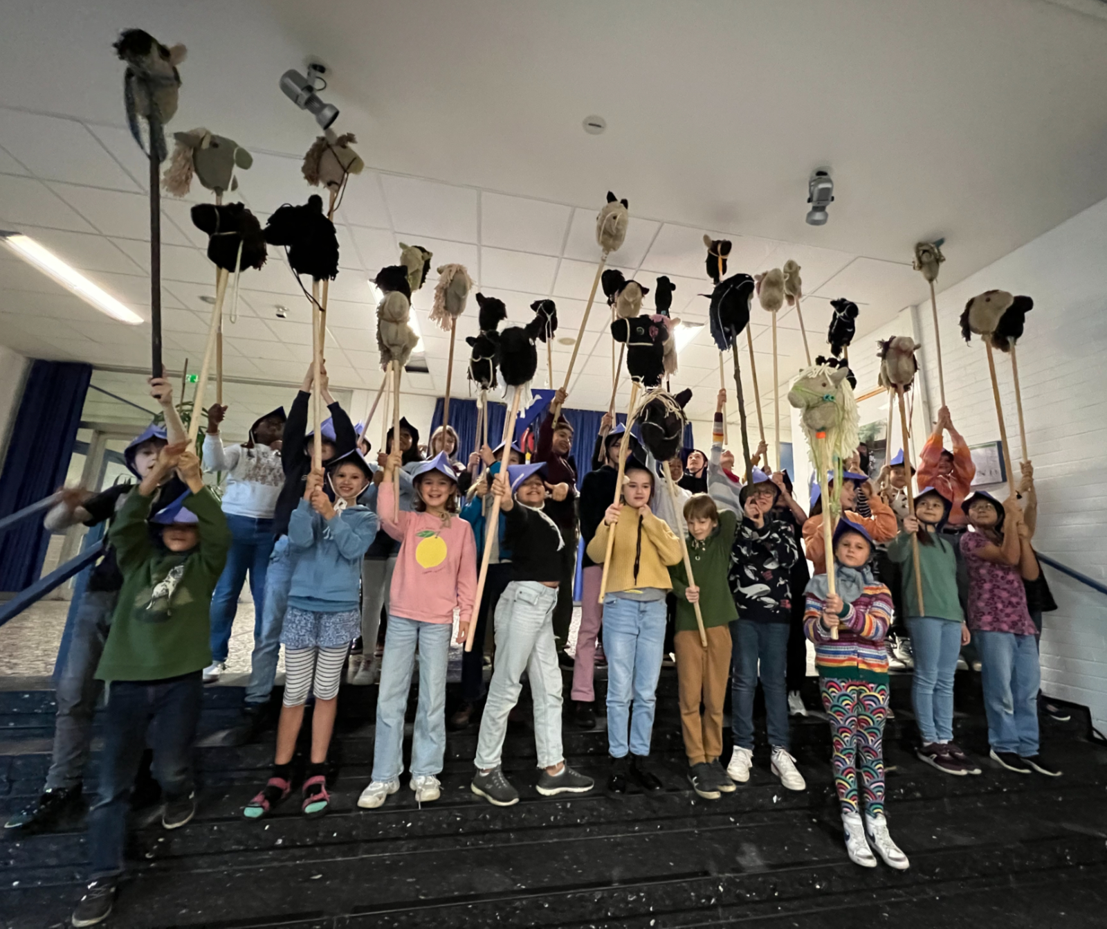 Zum Schluss kamen die Steckenpferdreiter der vierten Klassen mit ihren Steckenpferden und Hüten auf die Bühne und sangen natürlich "Wir Reiter ziehn durch Osnabrück".