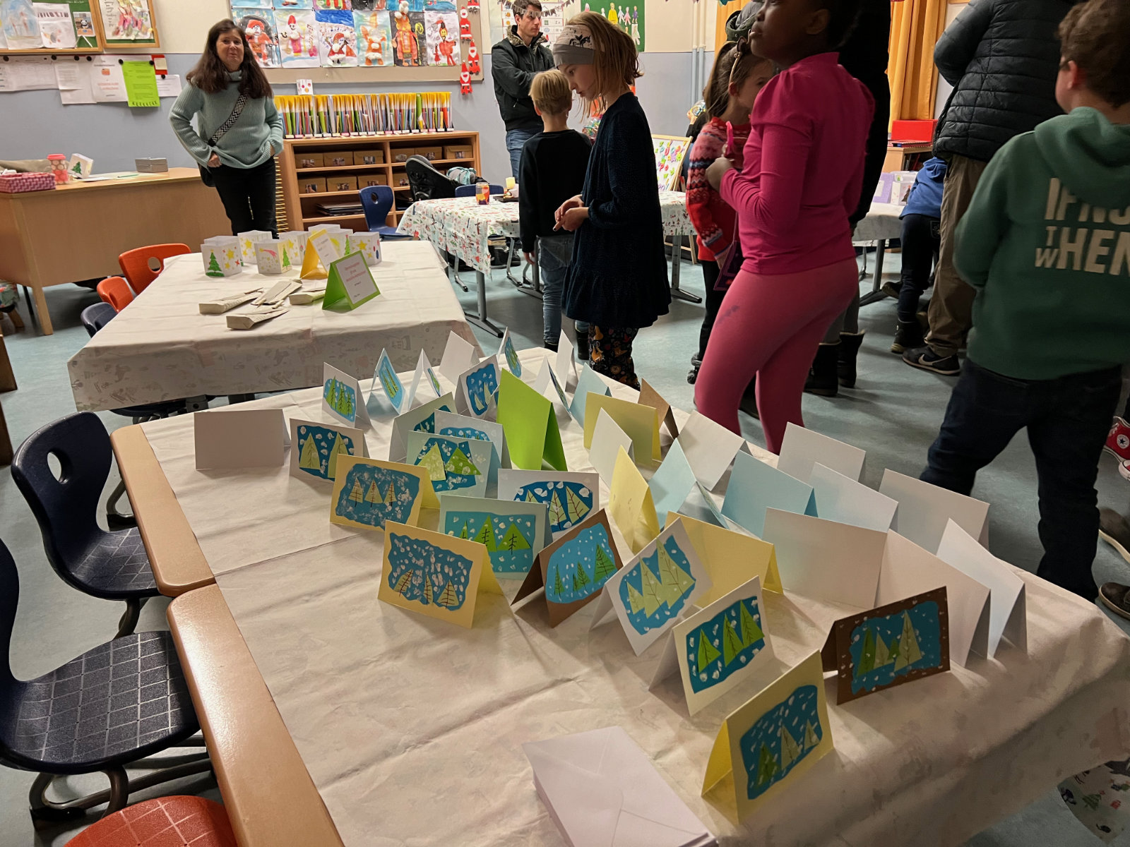 Anschließend öffnete der Basar mit den verschiedensten Angeboten: selbst gebackene Plätzchen, Weihnachtstüten, Weihnachtskarten, Lavendelsäckchen, Filzsterne und vieles mehr. Die Klasse 3b bot Kinderpunsch an, der aufgrund der hohen Nachfrage ganz schnell ausverkauft war. Die Cafeteria wurde von Eltern geleitet und bot ein reichhaltiges Kuchenbuffet. Draußen auf dem Schulhof wurden Würstchen gegrillt, eine Initiative aus der Elternschaft.